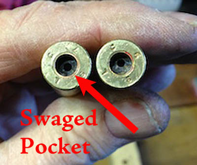 There are two basic methods of dealing with pocket crimps, reaming and swaging. Reaming involves removing material by cutting it away, and swaging uses force to stretch the brass and flow the crimp material back into the case head. Reaming can be done sitting in front of the TV with a towel or rag on your lap to catch the shavings. Swaging on the other hand needs to be done at your reloading bench, unless of course your significant other doesn’t mind a reloading press mounted into the coffee table. Again the reason for performing either of these operations is the insertion of a new primer which is rendered difficult if not impossible in the presence of said crimp
