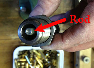 OK so here’s the dealio, basically you choose either the large or small components depending upon what size primer pockets you are dealing with. In the case of these ’06 cases we’re going large. Screw the rod into the die. The die by the way is totally non specific, it really just holds the rod in place.