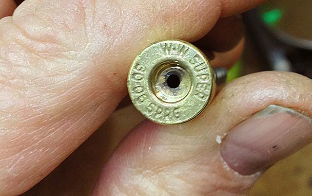 When we peer into the primer pocket we are abhorred to see grunge from the last firing, and some tumbler media stuck in the primer flash hole.