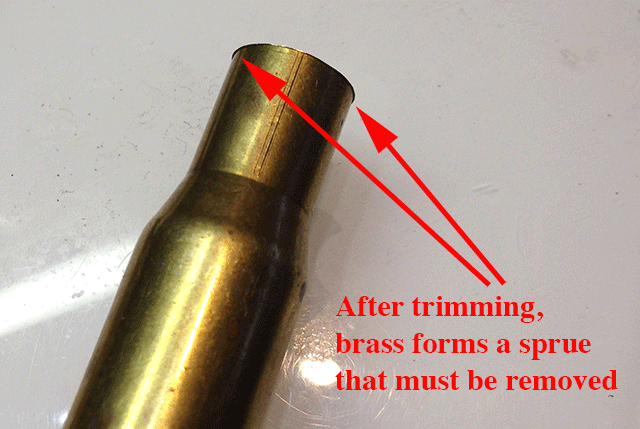 The process of case trimming leaves a “lip” or sprue around the inside and outside of the case mouth. This must be removed using a debarring tool.
