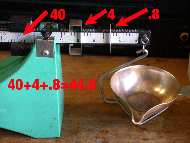 You now adjust the poises on an approach to weigh basis for your starting load. Our fictional example will be 44.8 grains. To achieve this, set the first poise to 40, the second to 4, and the last to .8 which would yield a charge of 44.8 grains. (not that I am recommending any such charge, but it gives you the idea)