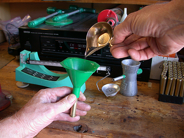 If you are fortunate enough to be able to afford a combination scale/powder dispenser, simply follow the set up instructions and enter your first charge weight. The dispenser/scale will automatically deliver the appropriate weight of powder into the pan. Take an empty, primed case, place a powder funnel over the case mouth and dump the weighed powder charge in to the case.
