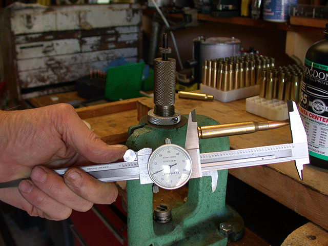 What you have now achieved is to seat the bullet to SAAMI COL and apply the appropriate crimp. Take this unprimed and powderless dummy round and make certain it chambers in your rifle. If it does so without any resistance you are well on your way. If the dummy round encounters resistance in chambering, and your CASE measures in conformity to SAAMI dimensions, you may have seated your projectile out too far. This is more likely to occur with heavier and lighter projectiles. It is likely that you will eventually want to tailor the seating depth to your specific projectile/rifle combination, but if you have followed the above you should have a decent seating depth.