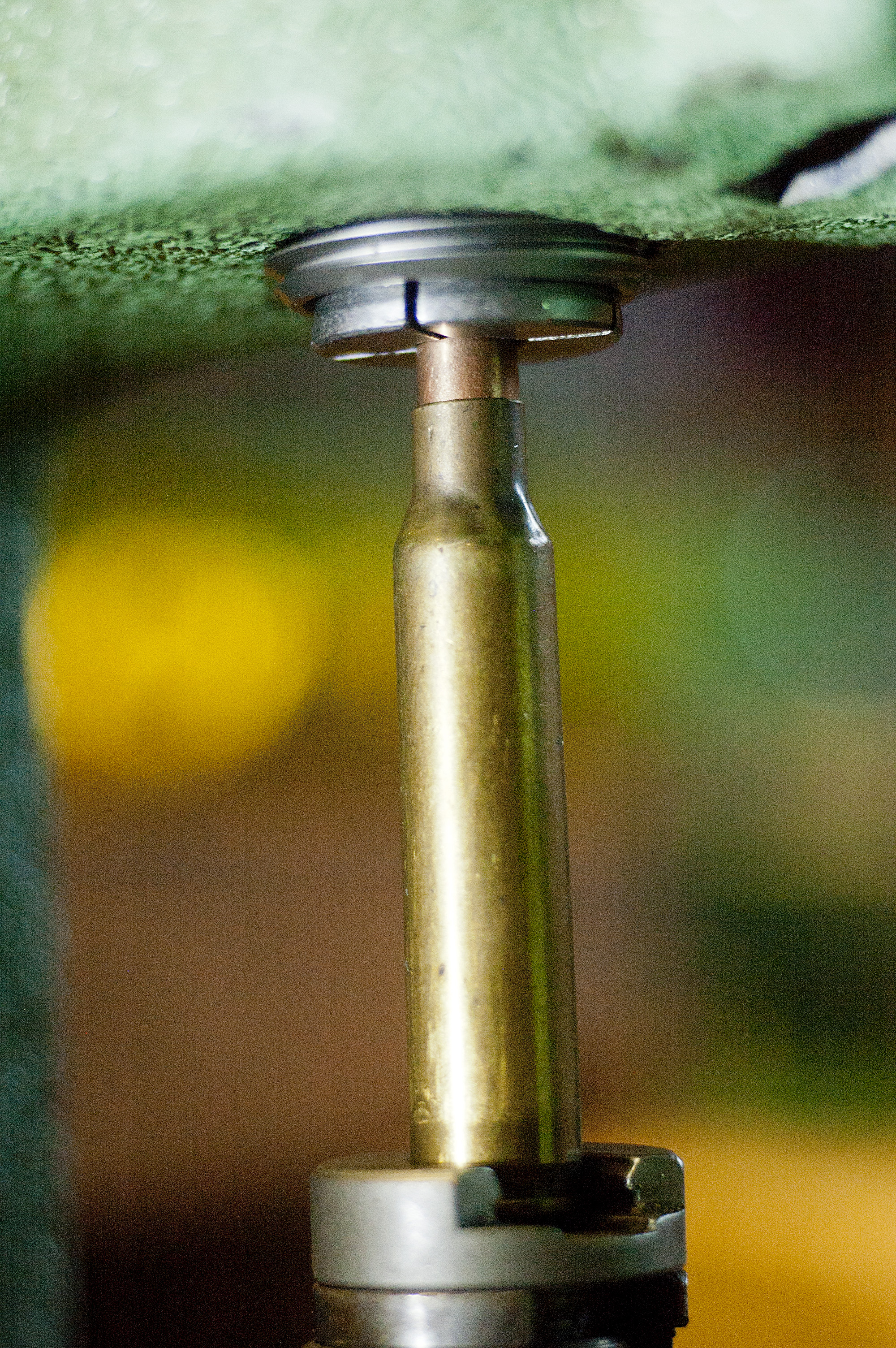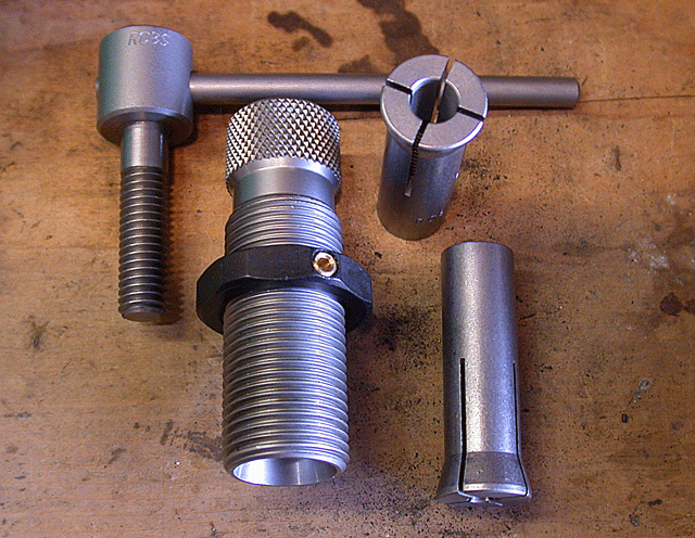 What happens as the die is seated more deeply into the press is that the shell holder contacts the bottom of the die which is actually a collet which is forced upward into the die body where an internal bevel forces the collet wings to close around the case neck, crimping the case neck onto the bullet’s body, or into the cannelure if one is present.
