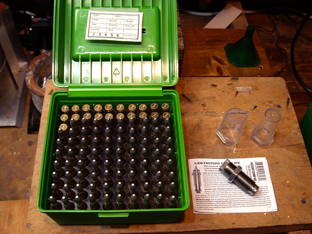 I went out an purchased a set of Lee Factory Crimp Dies in 308, 30-06, and 223. They were certainly cheap enough so I went for them in all my hand load calibers. I happened to have about 80 rounds of .308 with 170 grain cast heads sitting waiting for a day of fun at the range. They were a proven load that for the most part was I have actually happy with for practice. So I designed my test around them which consisted of crimping two alternate rows of previously loaded cartridges and  adding the rows between to my test as uncrimped. Not an entirely random selection but it should be good enough.