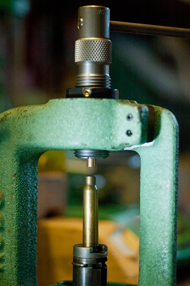 The crimping procedure is simple enough. Screw the appropriate die into your press until it contacts the raised ram with the appropriate shell holder in place. Tighten the locking ring until it contacts the top of the press.