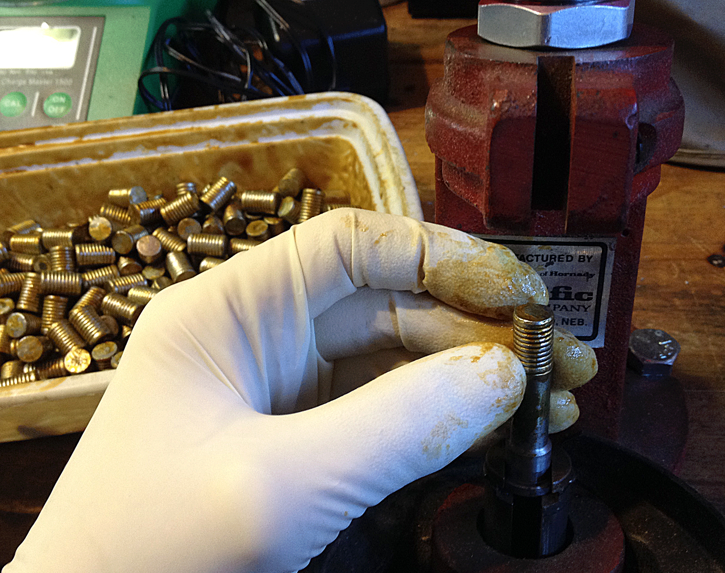 Well that wasn’t so bad was it? Oh you had a lube explosion? the stuff started oozing out around the rams and got all over your bench and floor? Two reasons, one you left the press idle without backing off the pressure on the lube reservoir, and two your lube got too warm. When this starts happening, unplug your heater and back off the pressure on your reservoir. This is a very messy process especially at first, but with a little practice and perseverance you will get better at it and make less of a mess each time. This is one process where I actually wear latex gloves, you might want to think about it too.