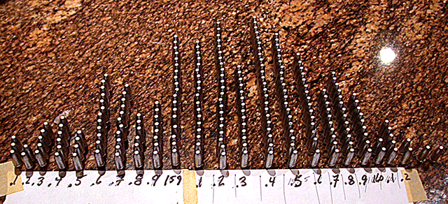 We can get an eyeball sense of how far to drive our projectile into the die by lining them up next to each other before assembly.
