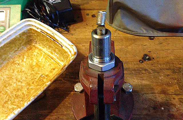 OK our press and lube are warm enough, so we start by turning the handle on the lube reservoir until it encounters resistance. Next, we take up a gas check and slip it into the hole in our sizing die open end up. If this is the first time you are using the die, or if you have cleaned it and it does not have lube in the channels, pre-lube your first bullet by wiping some lube on it by hand. Otherwise the first bullet you size may be the last.